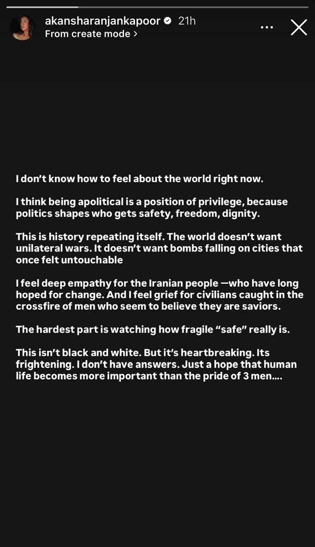 अपनी सहानुभूति साझा करते हुए, आकांशा ने अपनी इंस्टाग्राम स्टोरी पर लिखा, “मुझे नहीं पता कि इस समय दुनिया के बारे में कैसा महसूस करूं। मुझे लगता है कि गैर-राजनीतिक होना विशेषाधिकार की स्थिति है, क्योंकि राजनीति वह आकार देती है जिसे सुरक्षा, स्वतंत्रता और सम्मान मिलता है। यह इतिहास खुद को दोहरा रहा है। दुनिया एकतरफा युद्ध नहीं चाहती है। वह उन शहरों पर बम नहीं गिराना चाहती है जो कभी अछूत महसूस करते थे।”