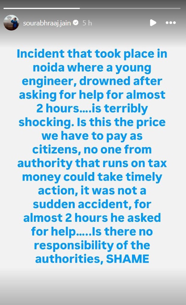 घटना पर प्रतिक्रिया देते हुए, सौरभ राज जैन ने अपना गुस्सा और अविश्वास व्यक्त करने के लिए इंस्टाग्राम का सहारा लिया। उन्होंने लिखा, “नोएडा में हुई घटना, जहां एक युवा इंजीनियर लगभग 2 घंटे तक मदद की गुहार लगाने के बाद डूब गया, अविश्वसनीय रूप से चौंकाने वाला है। क्या यह वह कीमत है जो हमें नागरिकों के रूप में सहन करनी चाहिए? हमारे करों द्वारा वित्त पोषित प्राधिकरण में से किसी ने भी समय पर कार्रवाई नहीं की। यह एक अप्रत्याशित दुर्घटना नहीं थी; उन्होंने लगभग 2 घंटे तक मदद मांगी। क्या अधिकारियों की कोई जिम्मेदारी नहीं है? शर्म की बात है।”