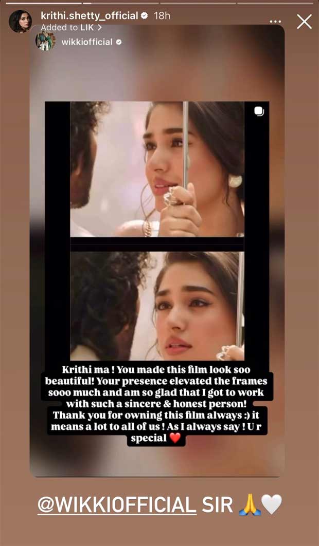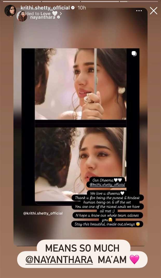 कृति के मूल LIK पोस्ट को अपने पेज पर साझा करते हुए, नयनतारा ने लिखा, “हमारा धीमा 🤍🤍 @krithi.shetty_official। हम आपसे प्यार करते हैं धीमा 🤍 सेट पर और बाहर सबसे शुद्ध और दयालु इंसान होने के लिए धन्यवाद। आप सबसे अच्छी आत्माओं में से एक हैं जिनसे हम सभी मिले हैं 🙂 आशा है कि आप जानते होंगे कि हमारी पूरी टीम आपसे प्यार करती है 🤗 हमेशा अंदर से बाहर तक खूबसूरत बने रहें 😇।” कृति ने सरल प्रतिक्रिया के साथ कहानी को फिर से साझा किया और जवाब दिया, “काफी मायने रखता है @नयनतारा मैम 🩷।” यह बताना कि यह प्रशंसा उसके लिए बहुत मायने रखती है।